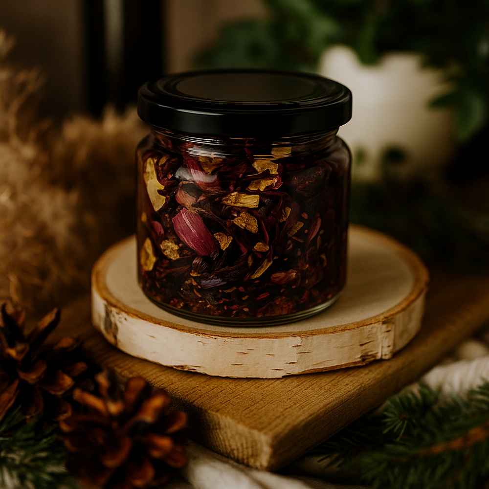 🧾 Składniki: hibiskus, pączki róży, rodzynki, skórka róży, migdały, jabłko, aronia, bławatek, aromat