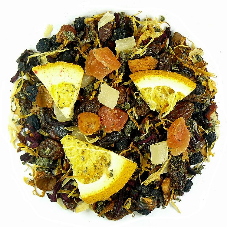 Każdy łyk tej herbatki to podróż przez aromaty owoców – od słodyczy ananasa i papai, po świeży akcent pomarańczy i lekko kwaskowy smak aronii. Liść maliny i płatki nagietka dopełniają całości, wprowadzając delikatność i naturalną harmonię.