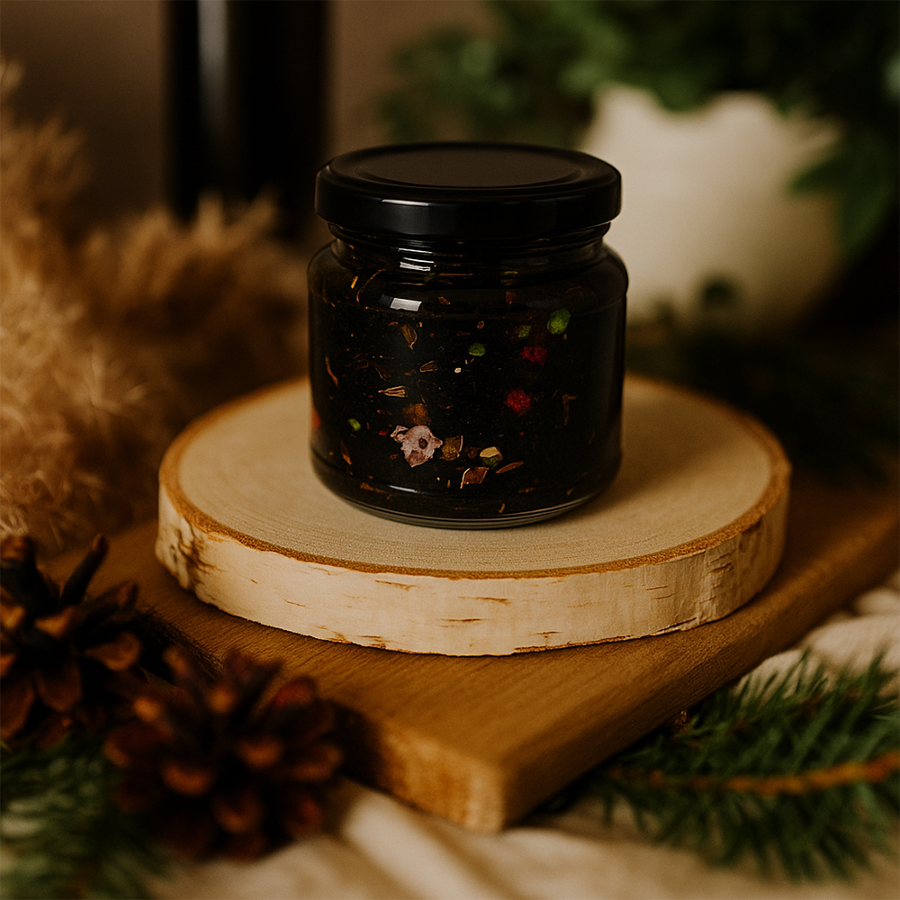 🧾 Składniki: czarna herbata Ceylon BOP1, dekoracje cukrowe, cytryna zielona kandyzowana, czerwona porzeczka, trawa cytrynowa, kwiat granatu, aromat