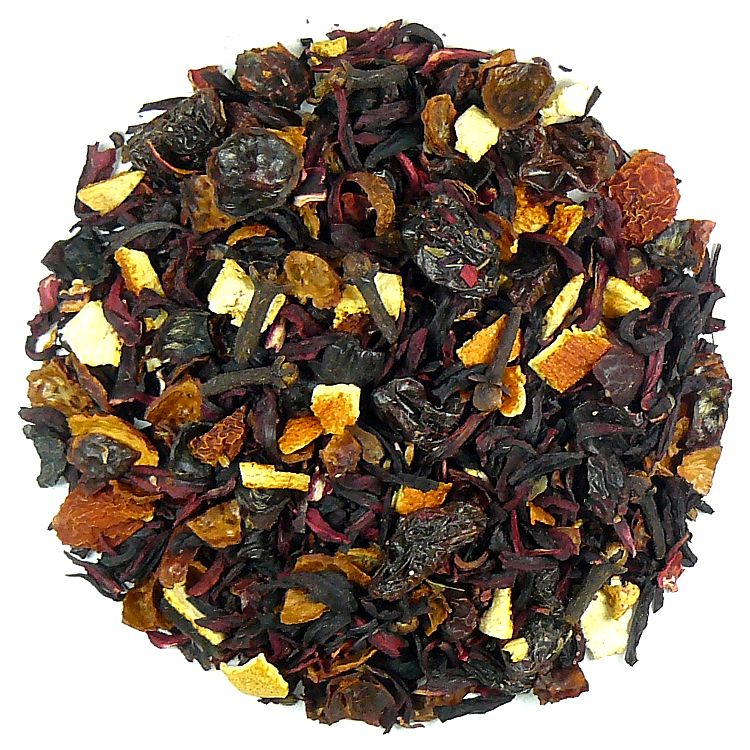 🧾 Składniki: hibiskus, cynamon kruszony, skórka róży, rodzynki, goździki, suszona skórka pomarańczy, aromat