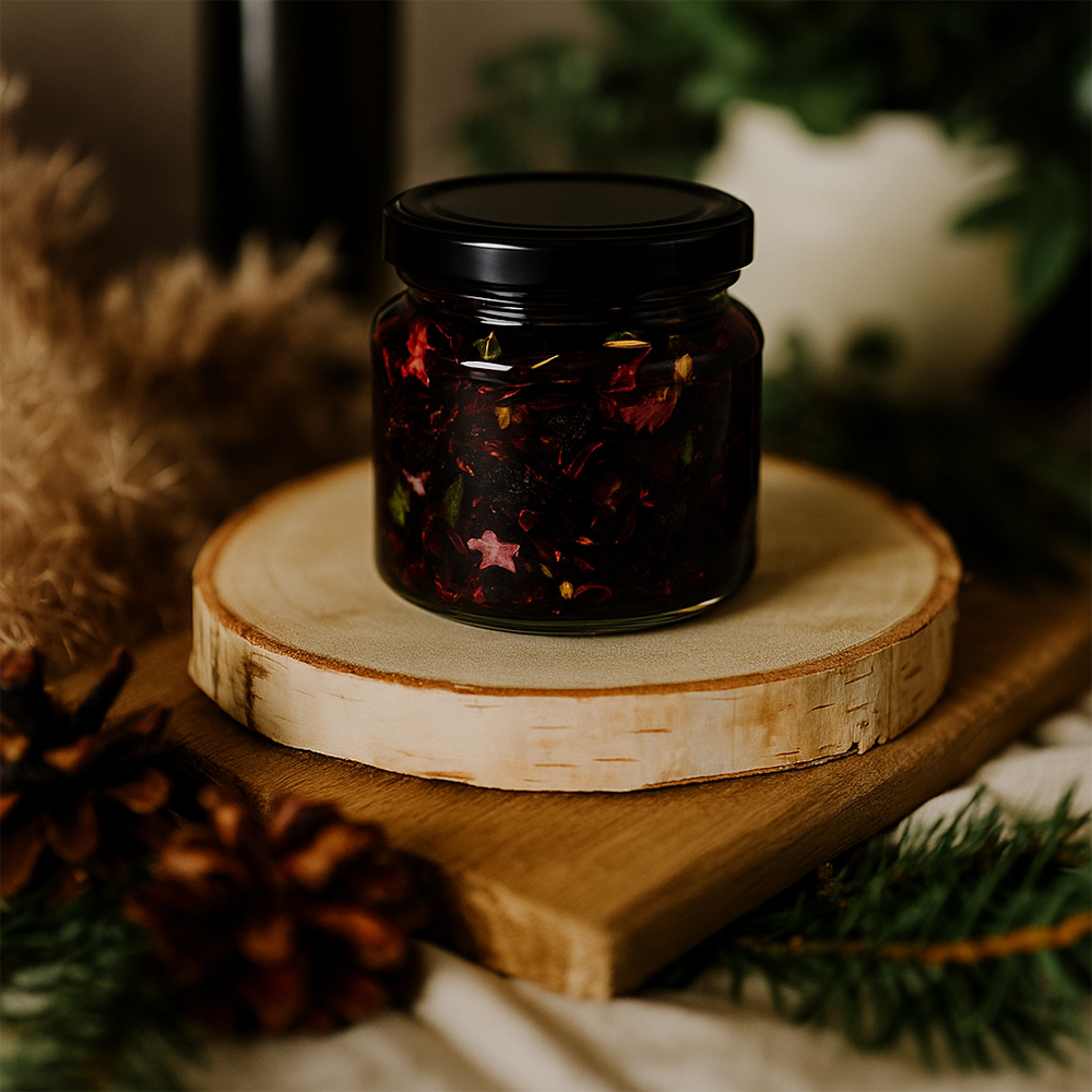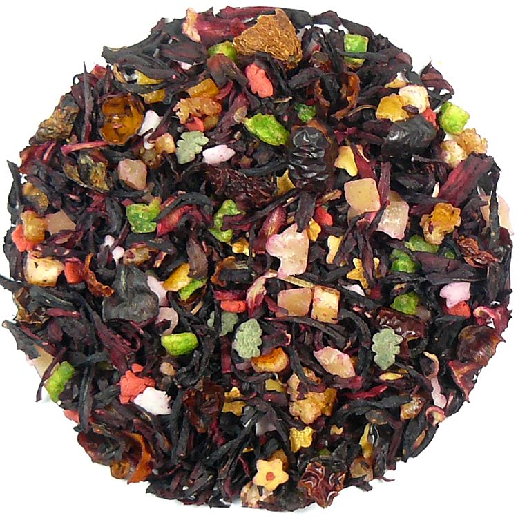 Kwaskowaty hibiskus tworzy energetyzującą bazę, którą równoważy słodycz kandyzowanego melona i zielonej cytryny. Skórka pomarańczy dodaje cytrusowej świeżości, a subtelna skórka róży wprowadza elegancką, delikatnie kwiatową nutę. Urocze dekoracje cukrowe sprawiają, że napar cieszy nie tylko smakiem, ale i wyglądem – jak misternie zdobiona świąteczna ozdoba.