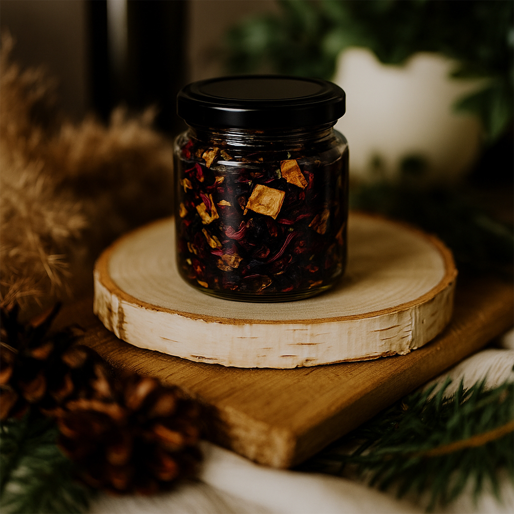 🧾 Składniki: hibiskus, skórka róży, jabłko, smoczy owoc liofilizowany, korzeń imbiru, cynamon, bławatek, aromat