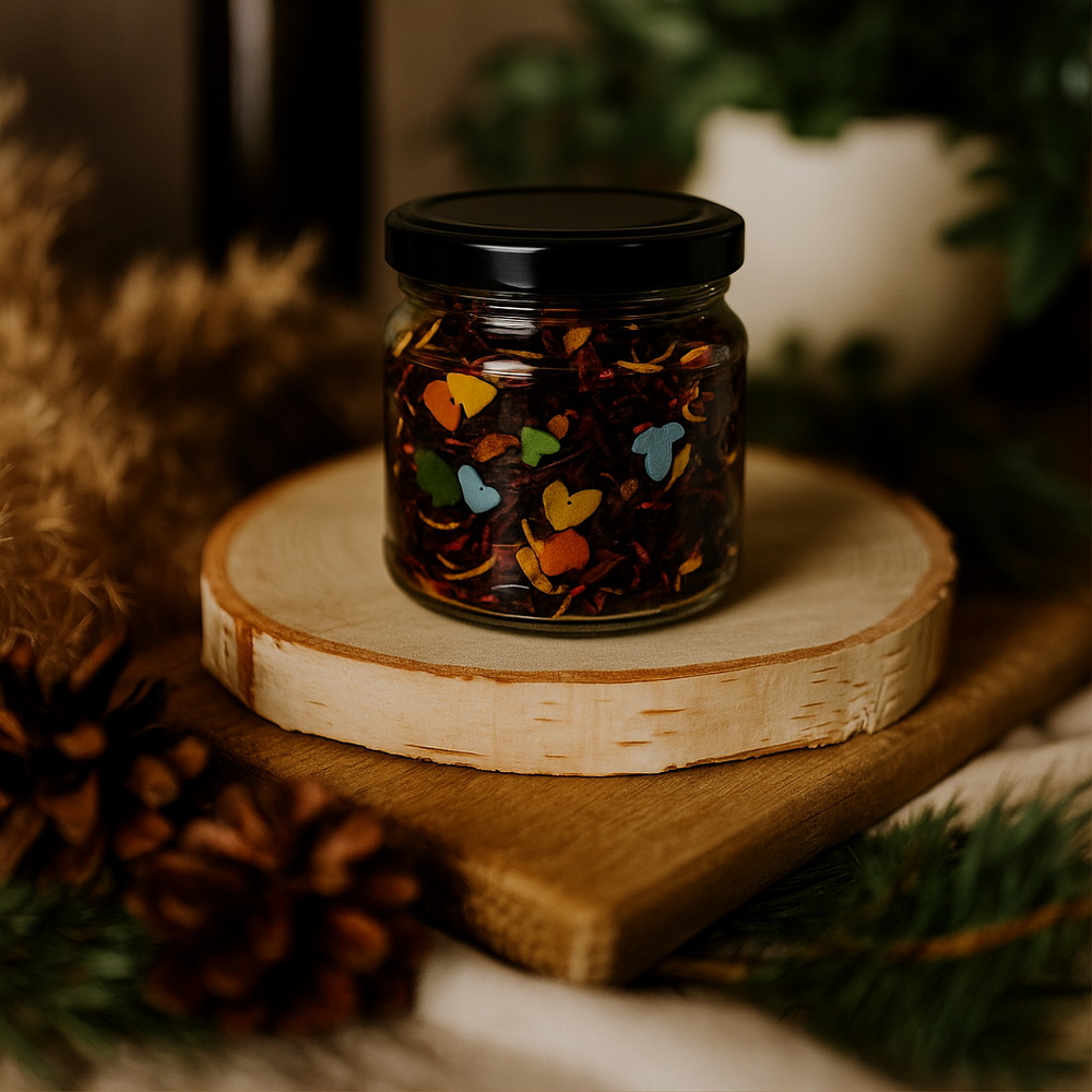 🧾 Składniki: hibiskus, papaja kandyzowana, dekoracje cukrowe, skórka róży, rodzynki, aromat