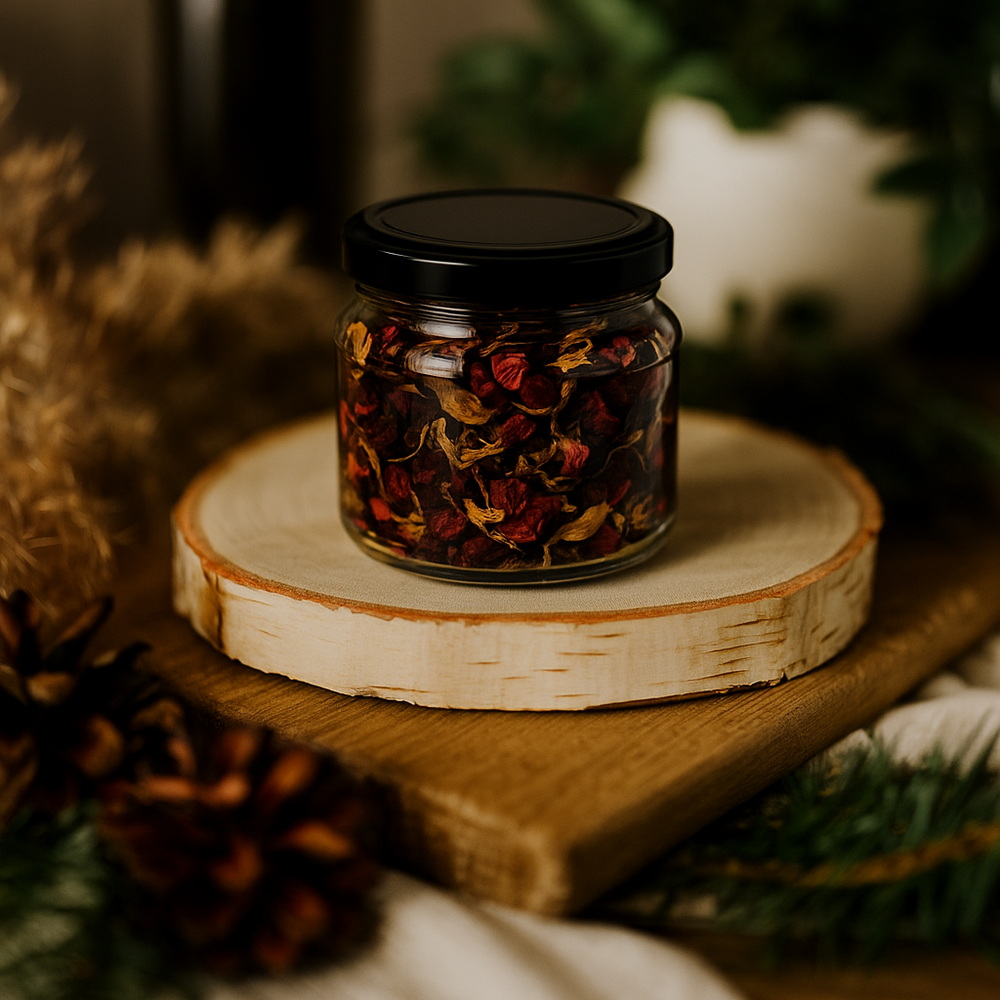 🧾 Składniki: hibiskus, skórka róży, ananas, rodzynki, porzeczka liofilizat, płatki róży, nagietek, bławatek, aromat